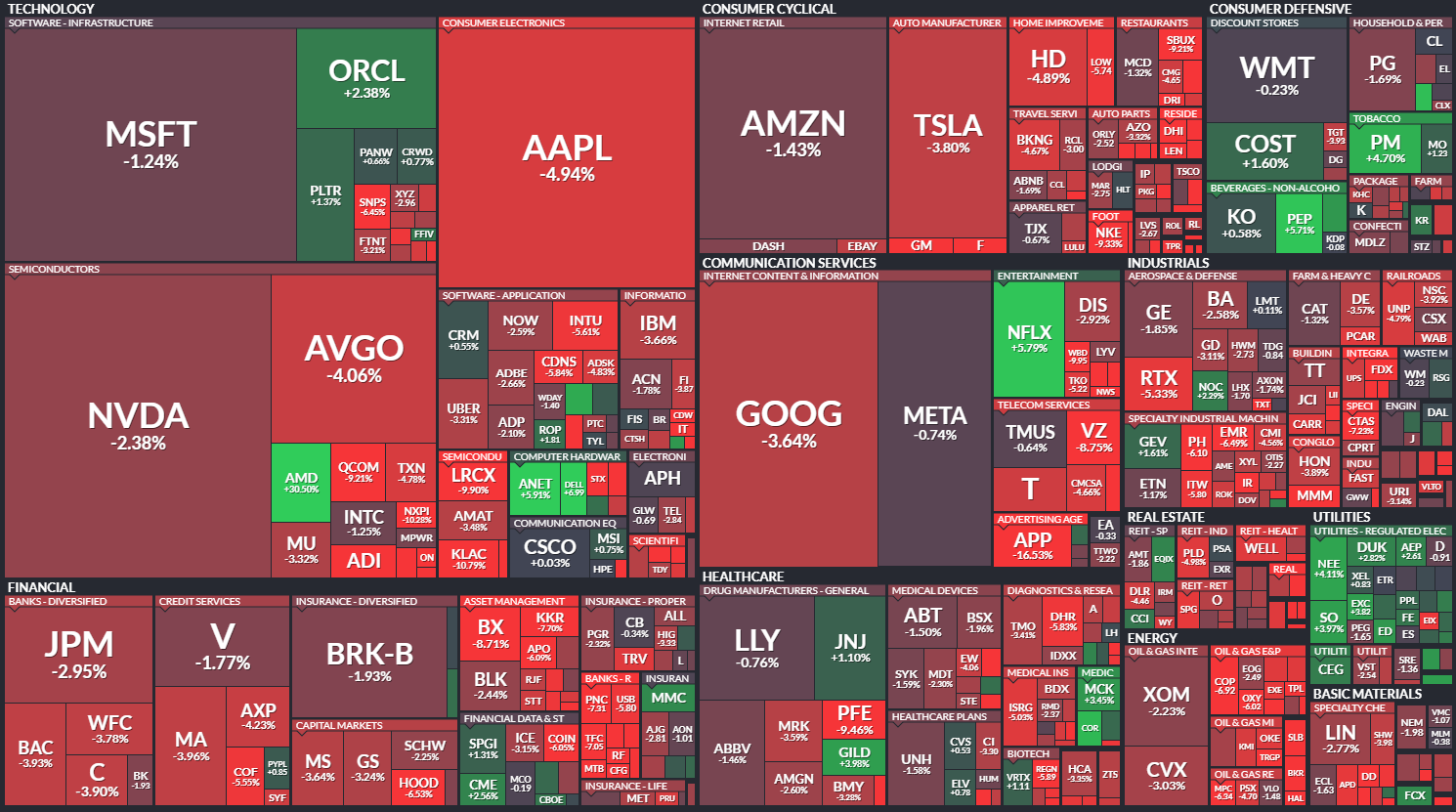 Финал недели оказался драматичным. Президент Трамп пригрозил «массовым повышением тарифов» на китайские товары в ответ на экспортные ограничения КНР по редкоземельным металлам. Это заявление вызвало резкую распродажу: Nasdaq упал на 3,5%, S&P 500 — почти на 3%. Лидеры роста недели — AMD, Nvidia, ARM — стали лидерами падения. Энергетика просела вслед за нефтью, а облигации подорожали — доходности рухнули к трёхнедельным минимумам.